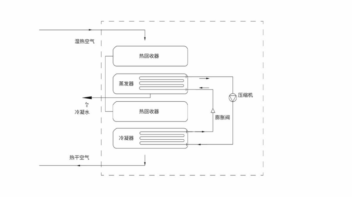 利用能源技術(shù)熱泵系統(tǒng)將來自干燥室的濕空氣降溫脫濕,同時回收水分凝結(jié)的潛熱再次加熱干燥空氣,它是除濕(去濕干燥)與熱泵(能量回收)的結(jié)合,是干燥過程中能量的循環(huán)利用。