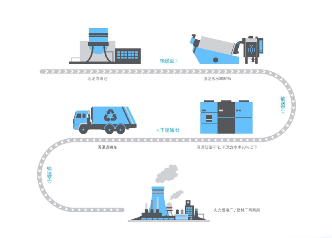 精創(chuàng)環(huán)保自主研發(fā)設(shè)計的污泥低溫干化設(shè)備,是利用熱泵低溫蒸發(fā)冷凝去濕原理,采用熱風(fēng)對流干燥的方式對網(wǎng)帶上的濕污泥進(jìn)行低溫蒸發(fā)脫水,并且循環(huán)冷凝濕空氣,使污泥得以干化。
